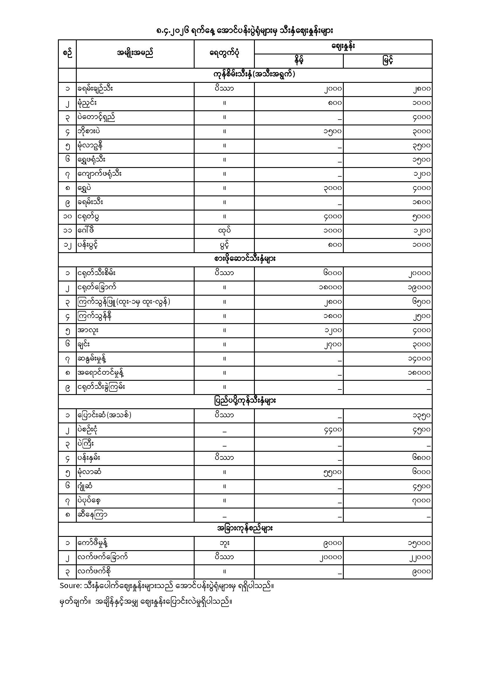 | ၅ | မြေထောက်ပဲ(သစ်) | ၂၈၅၀၀၀ | ၃၀၅၀၀၀ | ၅၄ |