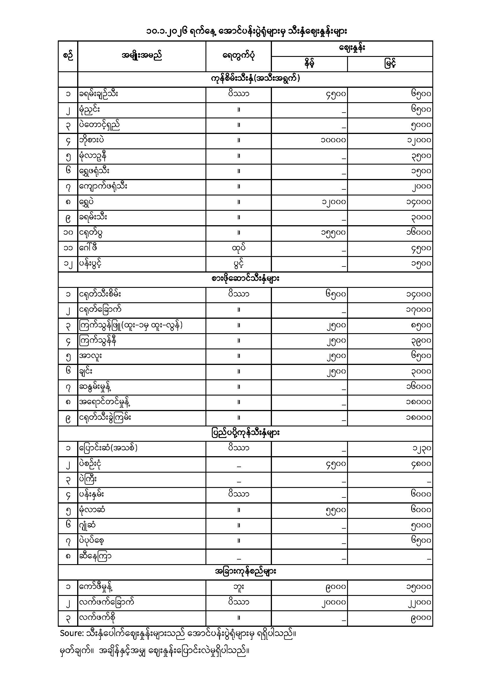ပြည်ကုန်စည်ဒိုင်၏ (၂၆.၁၁.၂၀၂၄)ရက်နေ့ ပဲမျိုးစုံဈေးနှုန်း Last Updated: 2024-11-26 စဉ် ကုန်ပစ္စည်းအမျိုးအမည် ရေတွက်ပုံ ဈေးနှုန်း ၁ မတ်ပဲ တင်း ၁၁၇၅၀၀ ၂ ပဲတီစိမ်း ။ ၉၇၀၀၀ ၃ ကုလားပဲ ။ ၁၀၂၀၀၀ ၄ ပဲကြီး ။ ၈၅၀၀၀ Category: ဈေးကွက်ဈေးနှုန်း Previous Post အသေးစားနှင့်အလတ်စားလုပ်ငန်းများ ငွေကြေးအာမခံမှုအစီအစဉ် တိုးမြှင့်ခြင်း စတင် Next Post ၂၆.၁၁.၂၀၂၄ ရက်နေ့မန္တလေးမြို့ ပွဲစား၊ ကုန်သည်၊ စက်ပိုင်များမဟာကထိန်တော်အသင်း ၏ ပ...