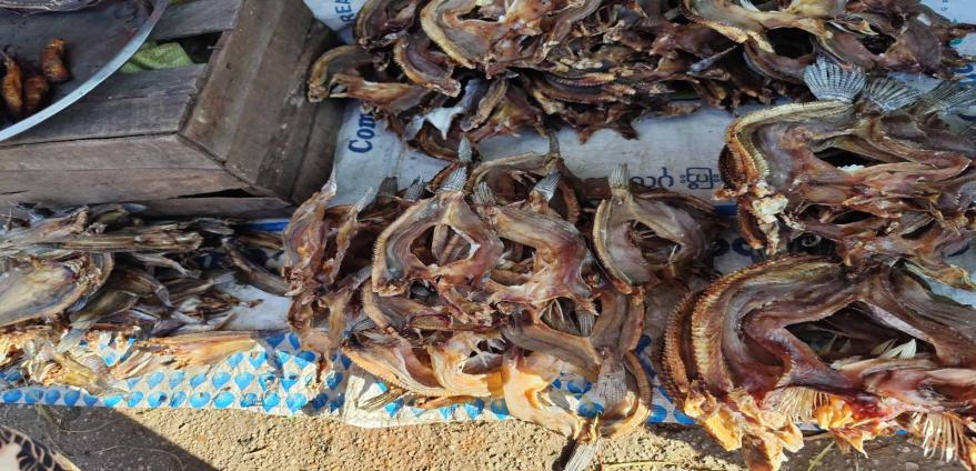 ဧရာဝတီတိုင်းဒေသကြီး၊ မအူပင်မြို့နယ် အင်းများမှ ထွက်ရှိသော ငါးရံ့များကို ငါးခြောက်လှမ်း၍ ဈေးကွက်အတွင်း ရောင်းချလျက်ရှိ