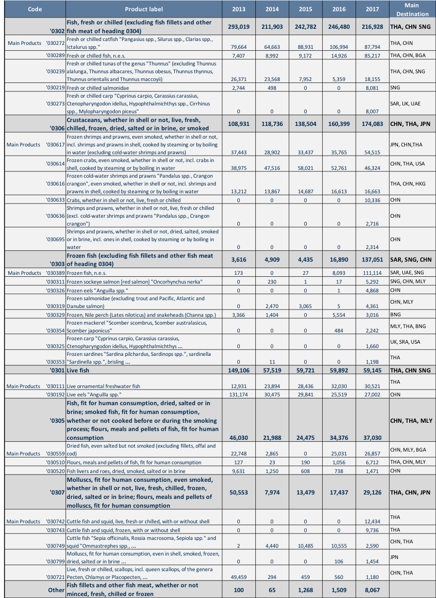 Myanmar’s Fish Exports over 2013-17 in US$’000 by product category